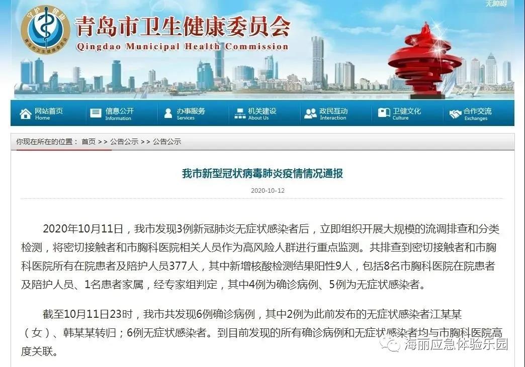 10月12日,青島市衛(wèi)健委通報(bào)該市新型冠狀病毒肺炎疫情情況。截至10月11日23時(shí),青島市共發(fā)現(xiàn)6例確診病例,其中2例為此前發(fā)布的無癥狀感染者江某某(女)、韓某某轉(zhuǎn)歸;6例無癥狀感染者。到目前發(fā)現(xiàn)的所有確診病例和無癥狀感染者均與市胸科醫(yī)院高度關(guān)聯(lián)。