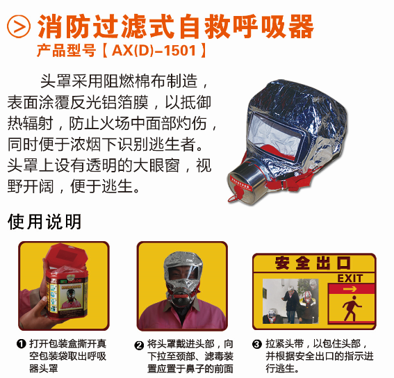 “安心”牌消防過(guò)濾式自救呼吸器頭罩采用阻燃棉布制造,表面涂覆反光鋁箔膜,以抵御熱輻射,防止火場(chǎng)中面部灼傷,同時(shí)便于濃煙下識(shí)別逃生者。