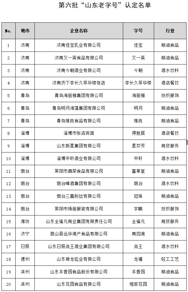 為推動(dòng)我省老字號(hào)創(chuàng)新發(fā)展,培育壯大老字號(hào)隊(duì)伍,健全我省老字號(hào)保護(hù)、傳承、創(chuàng)新、發(fā)展四個(gè)體系,根據(jù)《山東老字號(hào)認(rèn)定及保護(hù)促進(jìn)辦法》和《山東老字號(hào)認(rèn)定通則》,省商務(wù)廳會(huì)同省直有關(guān)部門及相關(guān)協(xié)會(huì)、專家、企業(yè)代表對(duì)各市推薦上報(bào)的第六批“山東老字號(hào)”申報(bào)企業(yè)進(jìn)行了嚴(yán)格評(píng)審,并將擬認(rèn)定企業(yè)名單面向社會(huì)進(jìn)行公示,公示結(jié)果在規(guī)定時(shí)間內(nèi)未收到異議。現(xiàn)認(rèn)定濟(jì)南佳寶乳業(yè)有限公司(注冊(cè)商標(biāo):佳寶)等20家企業(yè)為第六批“山東老字號(hào)”。