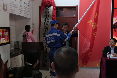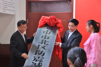 青島市地震局副局長郭玉貴、市北區(qū)區(qū)委常委副區(qū)長于洋共同為“市北區(qū)防震減災(zāi)宣傳教育基地”揭牌