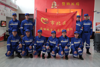 市北區(qū)區(qū)委常委副區(qū)長于洋為海麗地震志愿者救援隊授旗