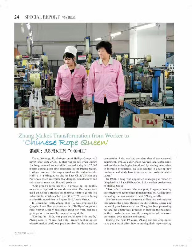 “業(yè)精于勤,荒于嬉;行成于思,毀于隨”,用在張旭明身上最貼切。36年的光陰,張旭明毫不吝嗇的奉獻給海麗雅,從織繩女工到“中國繩王”,這背后砥礪前行的痛楚也只有她自己最清楚。但是,路漫漫其修遠兮,張旭明會一直秉持“大國匠心”的理念,將繩纜產(chǎn)業(yè)做到極致,要讓自己的繩纜走出國門,站在世界的舞臺上,為國爭光!
