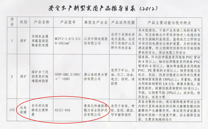 “安心”自冷卻式高層樓宇緩降器入選國家“千項”安全生產(chǎn)新型實用產(chǎn)品目錄