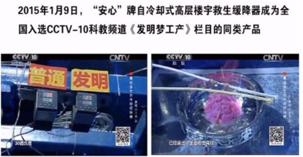 2015年1月9日,安心品牌自冷卻式高層逃生緩降裝置稱為全國(guó)入選CCTV-10科教頻道《發(fā)明夢(mèng)工廠》欄目的上榜產(chǎn)品。