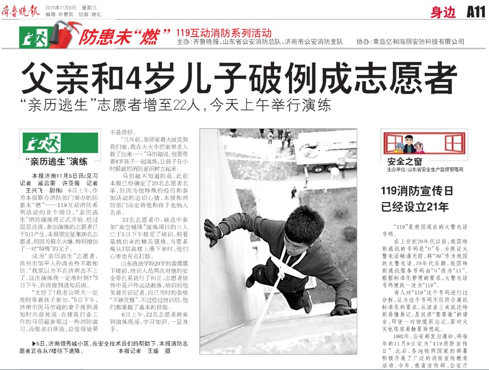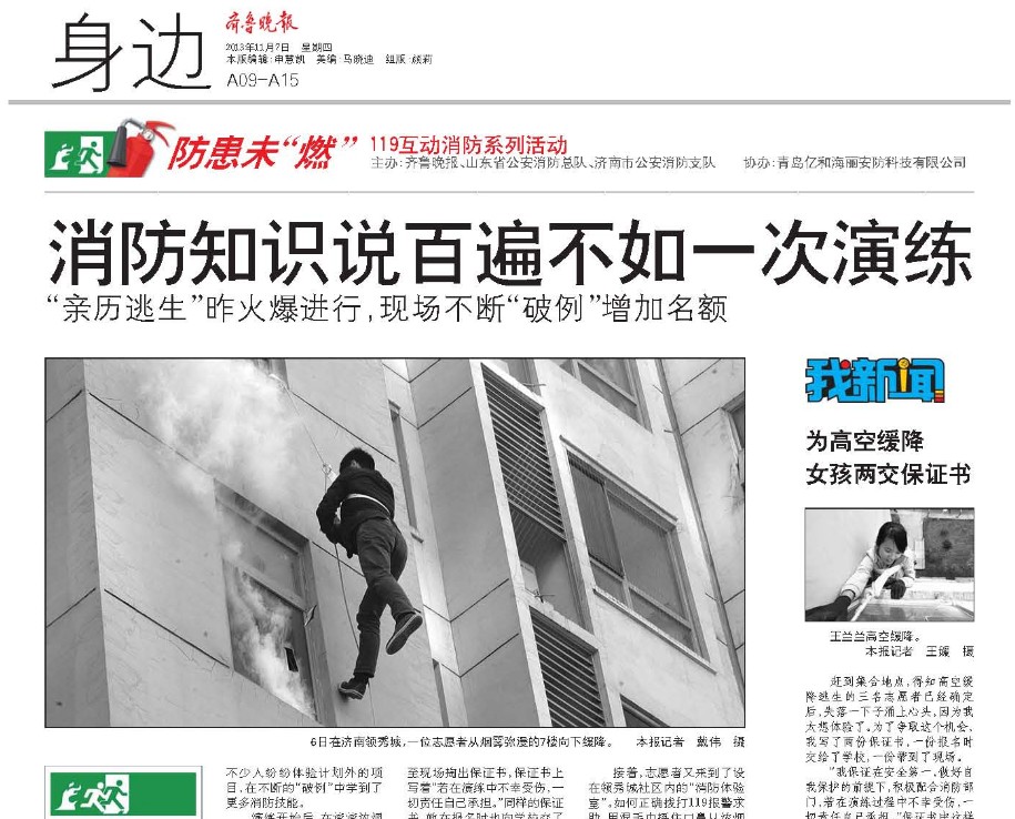 此次消防演練中,青島億和海麗安防科技有限公司模擬了一棟高層住宅突然起火,高樓層居民通過高空緩降器或多層樓宇逃生繩進(jìn)行逃生。并邀請(qǐng)了20名市民,參加了高層火災(zāi)逃生消防演練。